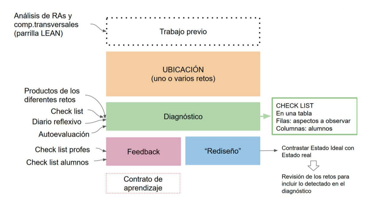 Evaluación diagnóstica, dentro de cada reto, el paso más apropiado para hacerlo es el 3 “Establecer parámetros”, pues en él el alumnado deberá preguntarse lo que debe saber, dominar... para poder dar una solución al reto. Ante estas preguntas, descubrirá que hay conocimientos, habilidades, destrezas que ya posee (él u otros componentes del equipo) y a partir de las cuales podrá adquirir otras que precisa. Por lo tanto, es un elemento también clave en el aprendizaje significativo.