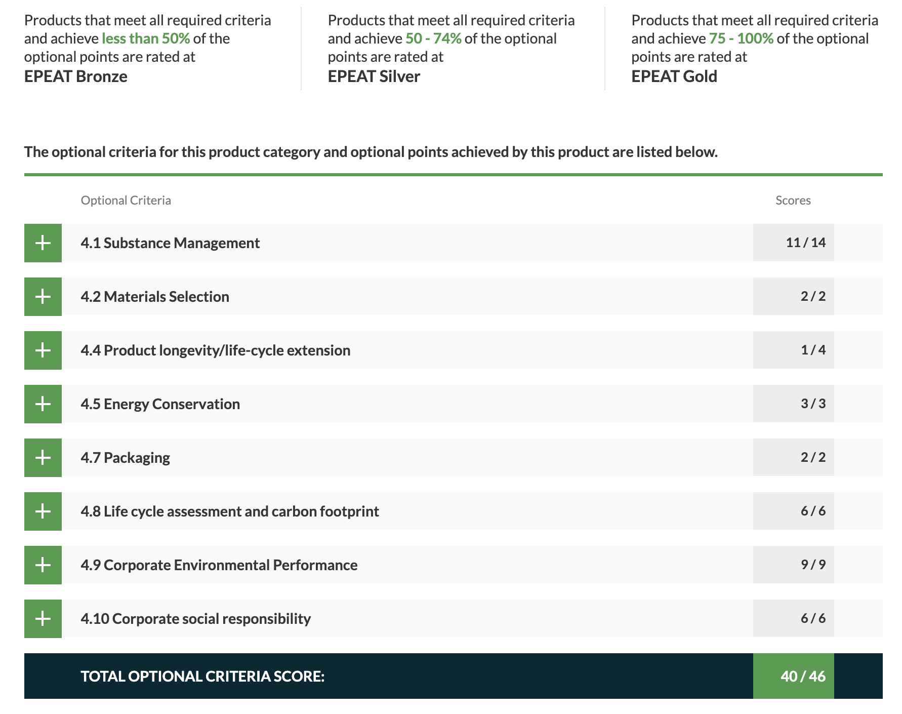 Sin embargo, Apple tiene una muy buena puntuación en el EPEAT, tanto el uso de Bronce, Plata y Oro, ya que cumple los criterios establecidos para considerarla una marca ética, como en el resto de puntos ya que cumple 45 de los 46, tal y como se puede observar en las capturas de sus análisis en la web.