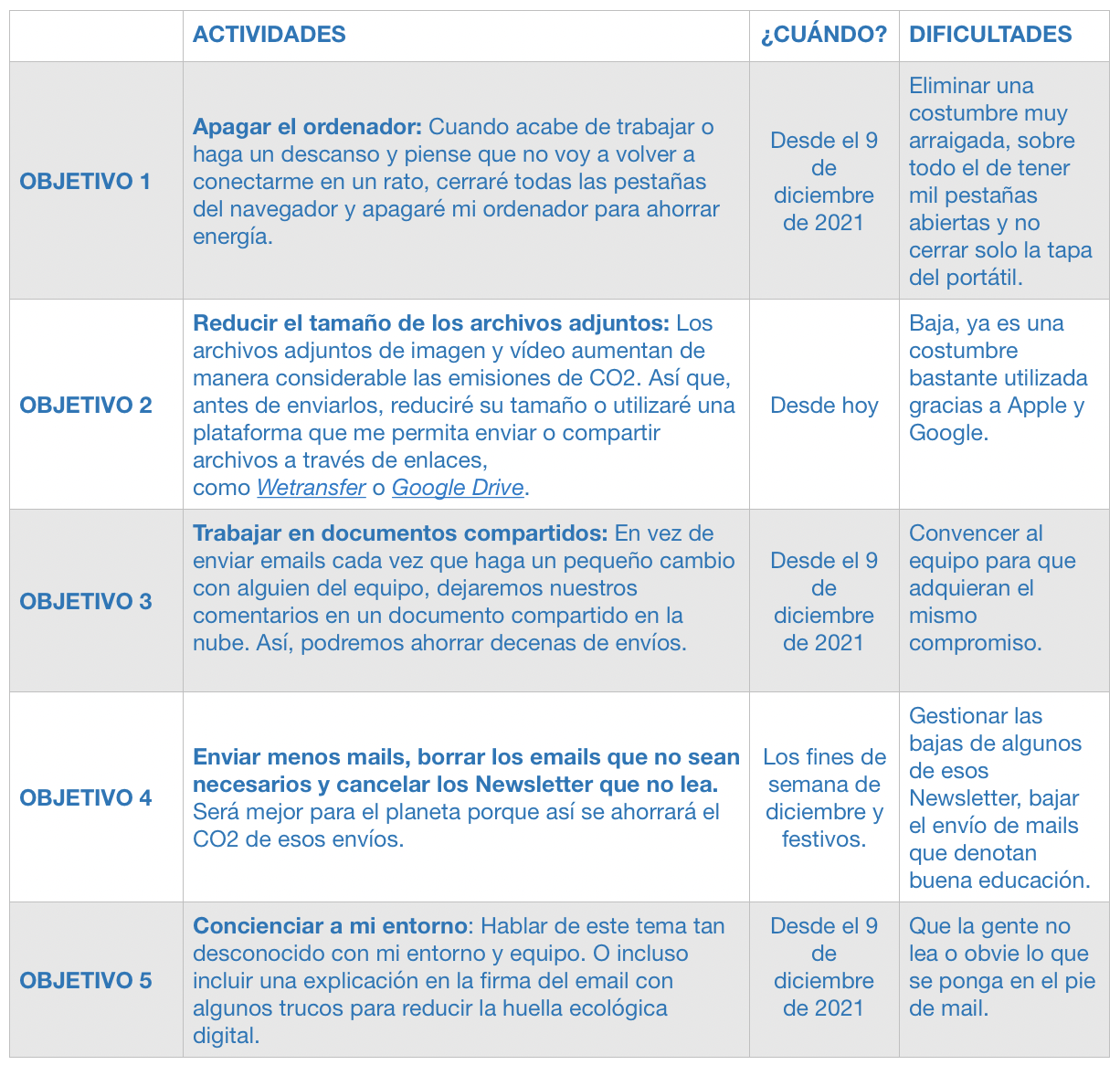 Tabla del Plan de acción para reducir mi Huella Ecológica Digital.